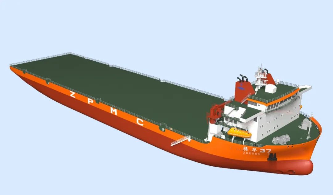 該項目總長170米,型寬40米,型深10.5米,箱形船體,直角船尾,舭部斜角、縱骨架式、單連續(xù)甲板鋼質焊接結構,艉部采用2套吊艙拉式推進器作為主推進裝置,服務航速下續(xù)航力大于18000海里,具備艉部與兩舷側滾裝滾卸功能,滿足無限航區(qū)調遣作業(yè)要求,具有甲板面積大、作業(yè)水深大、抗風等級強等優(yōu)點,是振華重工自建的第一艘3萬噸級甲板船。